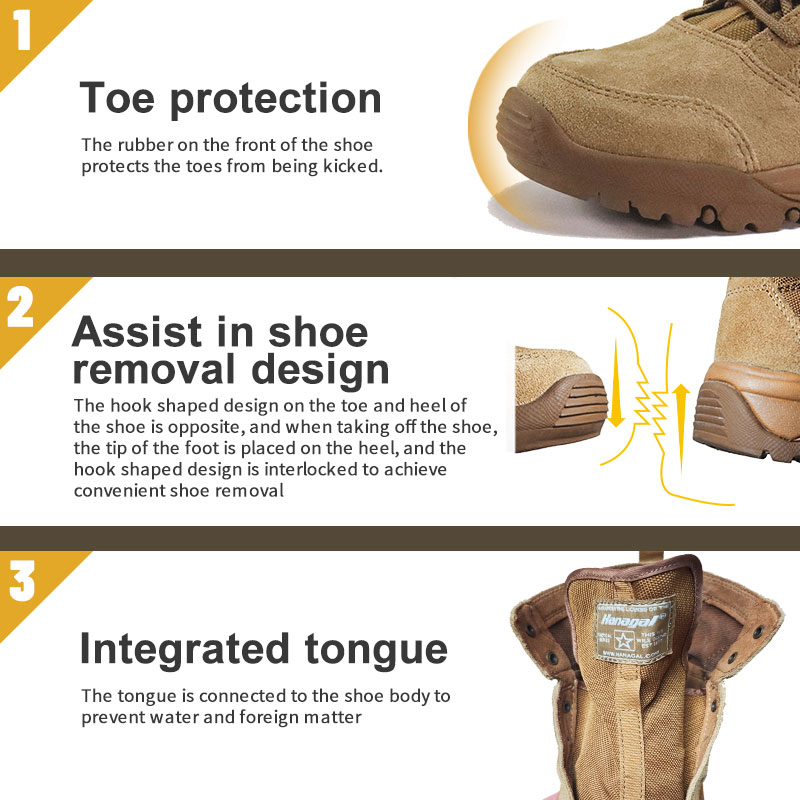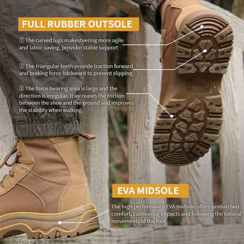 Estas botas tácticas desierto de caucho y tela Cordura están en stock y listas para enviarse, con pedidos a partir de solo 10 pares. Para obtener más detalles o consultas sobre precios, no dude en comunicarse con nosotros en cualquier momento. La personalización también está disponible con un pedido mínimo de 800 pares. Y este modelo tiene las siguientes ventajas: