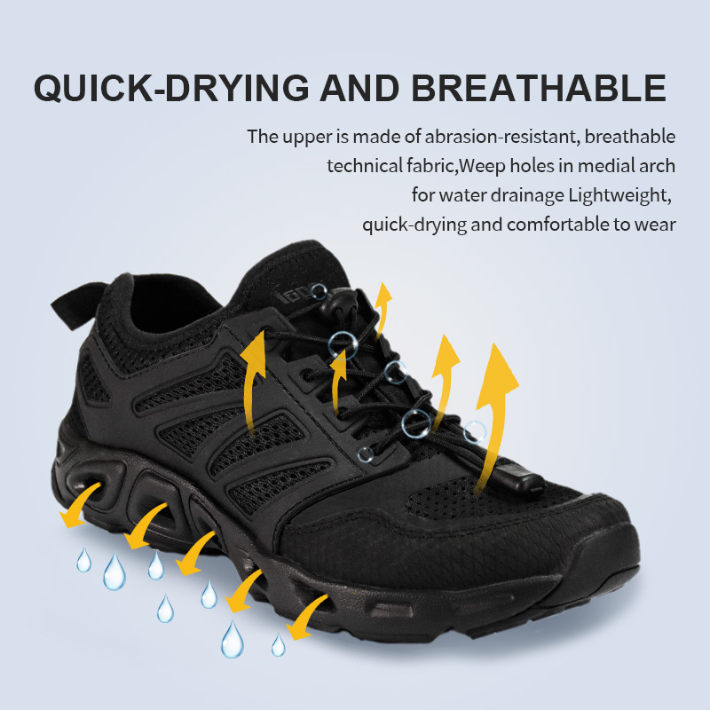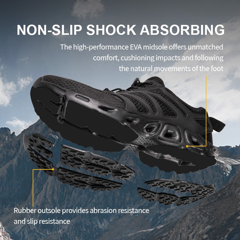 Los zapatos de trekking con absorción de impactos EVA están diseñados para el sendero, húmedo o seco. Con materiales de secado rápido y puertos de drenaje en el arco, arroja agua rápidamente cuando vas del arroyo a la cumbre. Un parche de goma en el talón garantiza la estabilidad, mientras que la entresuela de EVA brinda comodidad suave y amortiguadora bajo los pies. ¿Y la resistente suela de goma? Diseñado para agarrar casi cualquier cosa: roca, barro, grava suelta. Es anfibio, ágil y está diseñado para moverse contigo.
