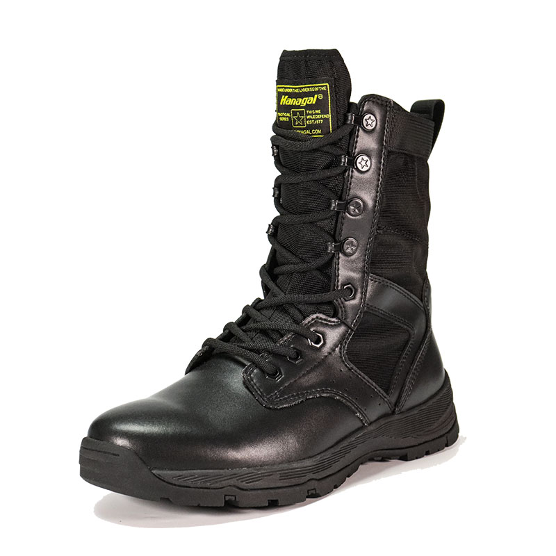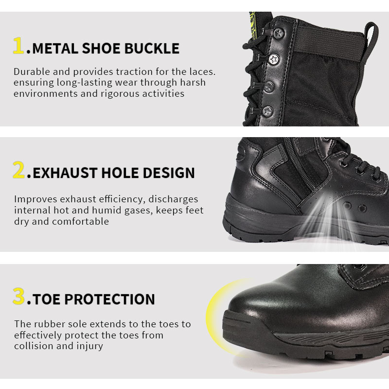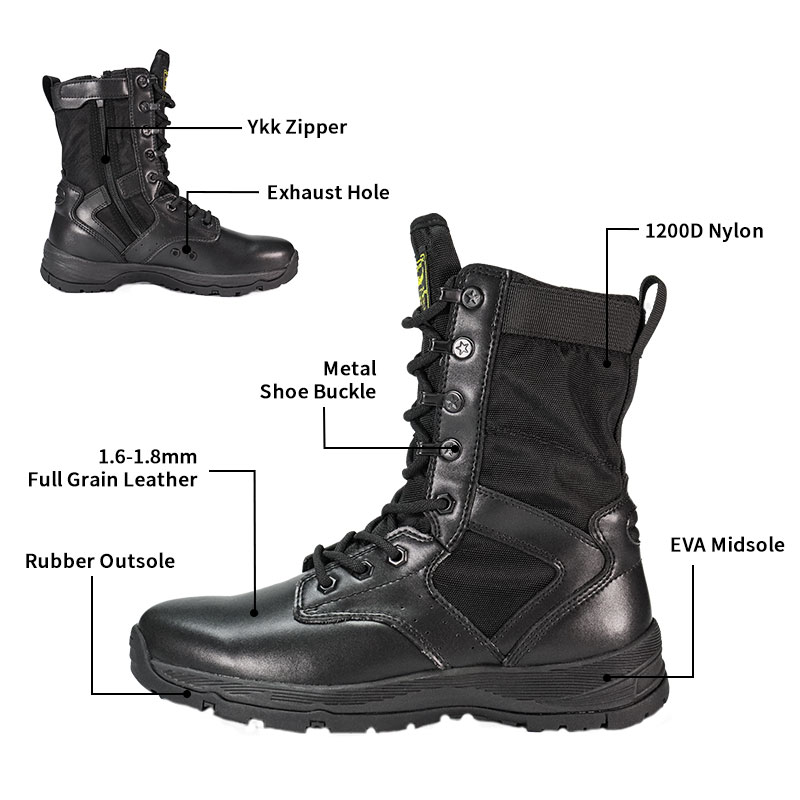 Estas botas policiales con suela de goma completa están en stock y listas para enviarse, con pedidos a partir de solo 10 pares. Para obtener más detalles o consultas sobre precios, no dude en comunicarse con nosotros en cualquier momento. La personalización también está disponible con un pedido mínimo de 800 pares. Y este modelo tiene las siguientes ventajas: