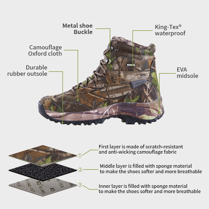 ①La primera capa está hecha de tela de camuflaje resistente a los arañazos y a la humedad. ②La capa intermedia está rellena con material de esponja para que los zapatos sean más suaves y transpirables. ③La capa interior está rellena con material de esponja para que los zapatos sean más suaves y transpirables.