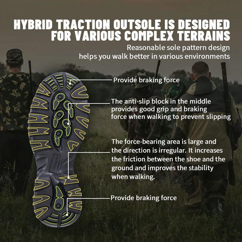 ①La plantilla Poliyou de alta elasticidad que absorbe la humedad mantiene el interior seco. ②Entresuela de EVA, envuelta en tela de camuflaje, amortiguación y absorción de impactos. ③Suela de goma duradera, antideslizante y resistente al desgaste.