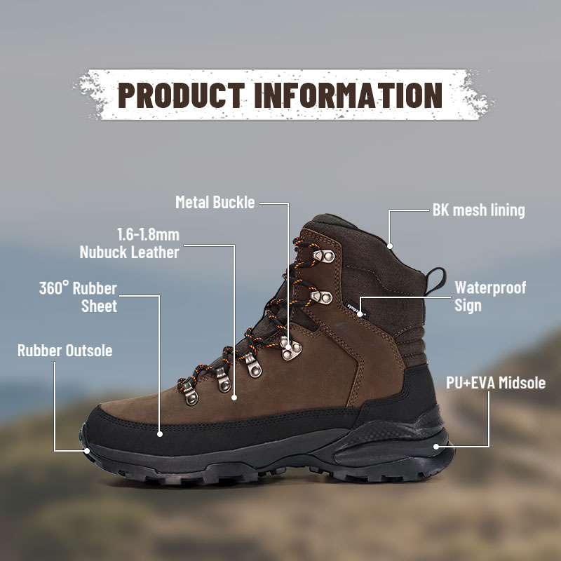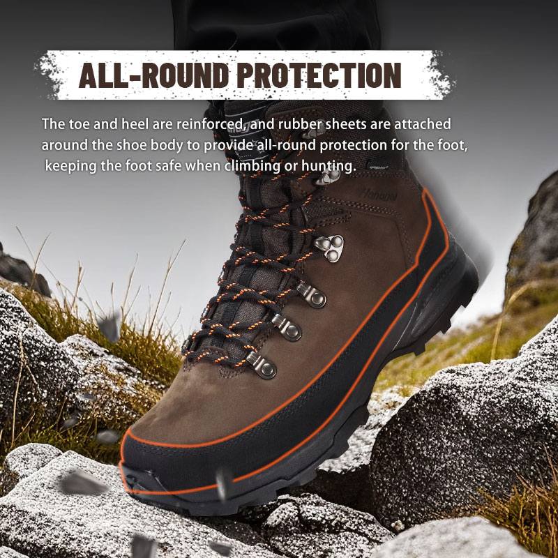 La puntera y el talón están reforzados y se colocan láminas de goma alrededor del cuerpo del zapato para brindar protección integral al pie, manteniéndolo seguro al escalar o cazar.