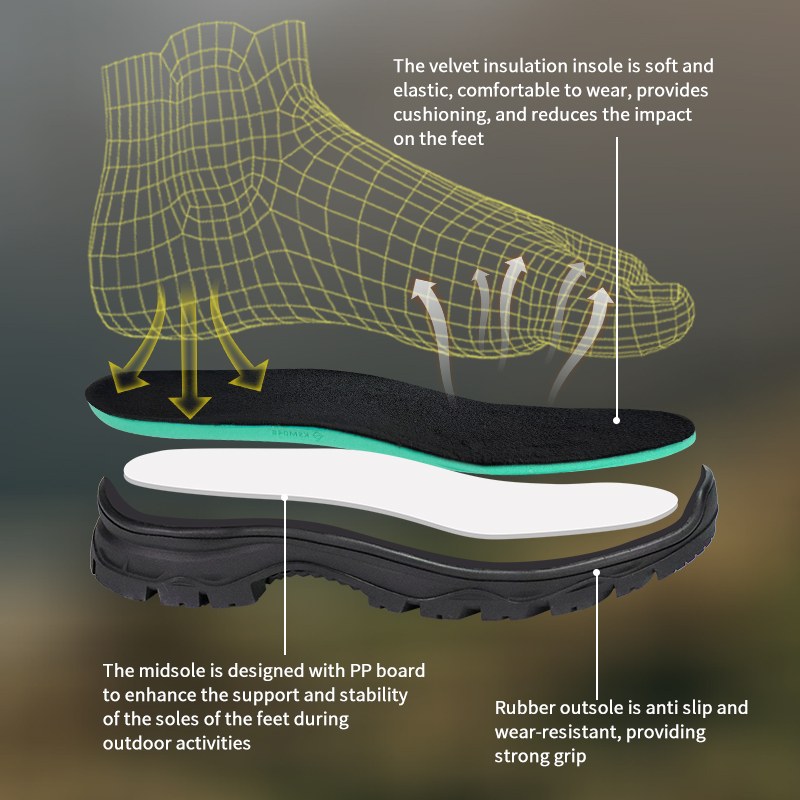①Forro de terciopelo. Suave bajo los pies. Absorbe el impacto. ②Entresuela de PP para un soporte estable. ③Suela de goma que no se suelta. Se agarra, dura y se mantiene confiable.