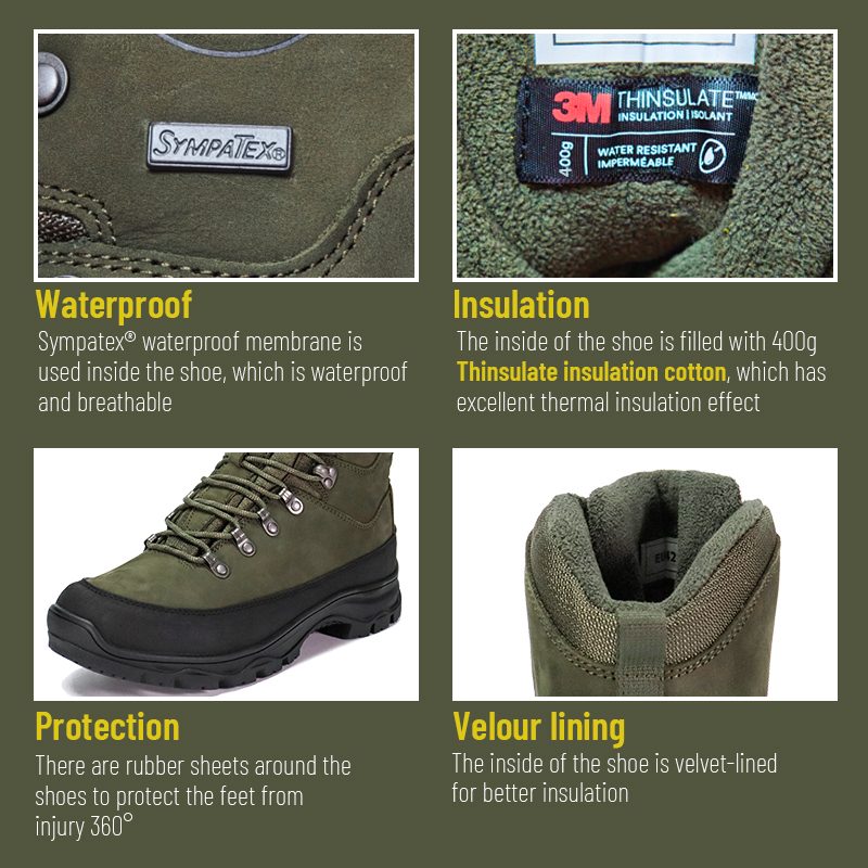 Estas botas de caza Sympatex Waterproof Insulation Thinsulate están disponibles para personalización en colores, materiales y detalles, con una cantidad mínima de pedido de 800 pares, ideales para colaboraciones de marca y adquisiciones grupales. Y estas botas de caza tienen las siguientes ventajas: